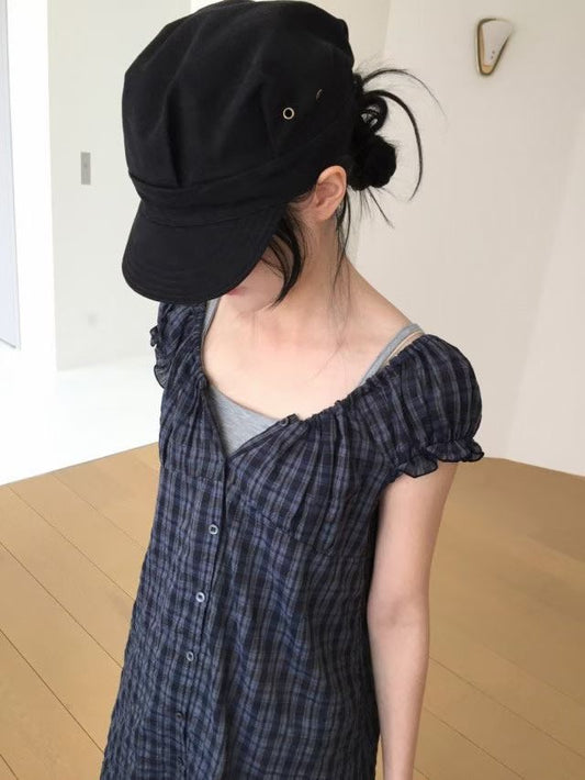 復古格仔泡泡袖ops - OA622